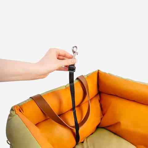 Dzięki regulowanemu paskowi na zagłówek oraz haczykom z tyłu, fotelik stabilnie utrzymuje się na miejscu. Wbudowana smycz z karabińczykiem pozwala bezpiecznie przypiąć pupila do szelek.