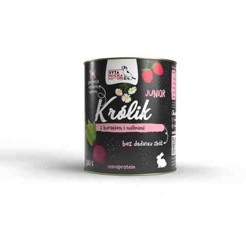 Odkryj połączenie delikatnego mięsa z królika, odżywczej brukwi, pełnej witamin truskawki i aromatycznego rozmarynu w pełnoporcjowej karmie mokrej od Sytej Michy. To zdrowy i doskonale zbilansowany posiłek stworzony z myślą o dorosłych psach wszystkich ras, również tych z wrażliwym przewodem pokarmowym i skłonnościami do alergii.