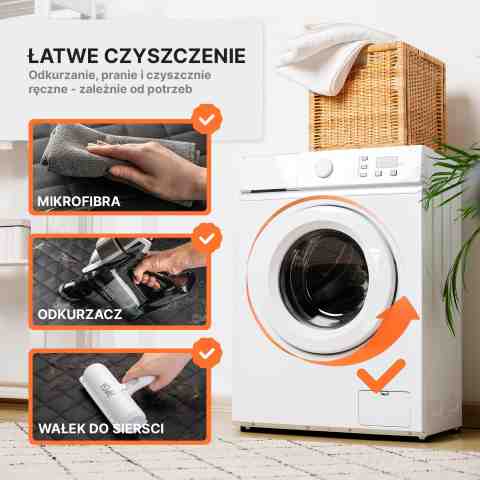 Łatwość w czyszczeniu: Dzięki wodoodporności materiału mata jest łatwa do czyszczenia. Brud i sierść nie przywierają, a materiał szybko schnie. Można ją czyścić wilgotną szmatką lub prać ręcznie lub w pralce, zachowując jej właściwości.