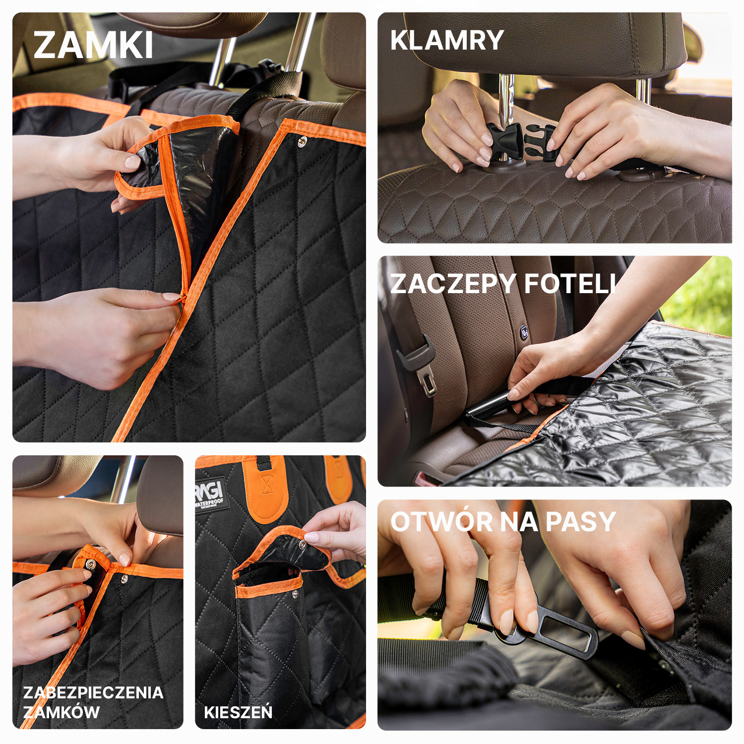 Intuicyjny montaż i demontaż: Mata posiada klamry na zagłówki, rolki-kotwice do montażu między fotelami, boczne pasy do uchwytów oraz otwory na pasy bezpieczeństwa. Zamki błyskawiczne są zabezpieczone zakładką na zatrzask, co ułatwia montaż i demontaż.