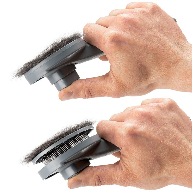 - ERGONOMICZNY KSZTAŁT – okrągła końcówka szczotki samoczyszczącej pozwala wyczesywać sierść z delikatnych, trudniej dostępnych miejsc.