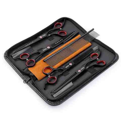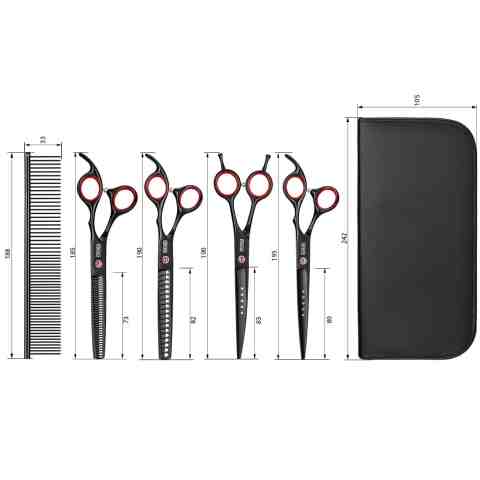 - Kompleksowy Zestaw Narzędzi: Oferuje różnorodność nożyczek (w tym proste, do przerzedzania, zakrzywione) oraz akcesoria niezbędne do pielęgnacji, jak ściereczka do czyszczenia, klucz do regulacji, olejek do konserwacji i solidny metalowy grzebień.